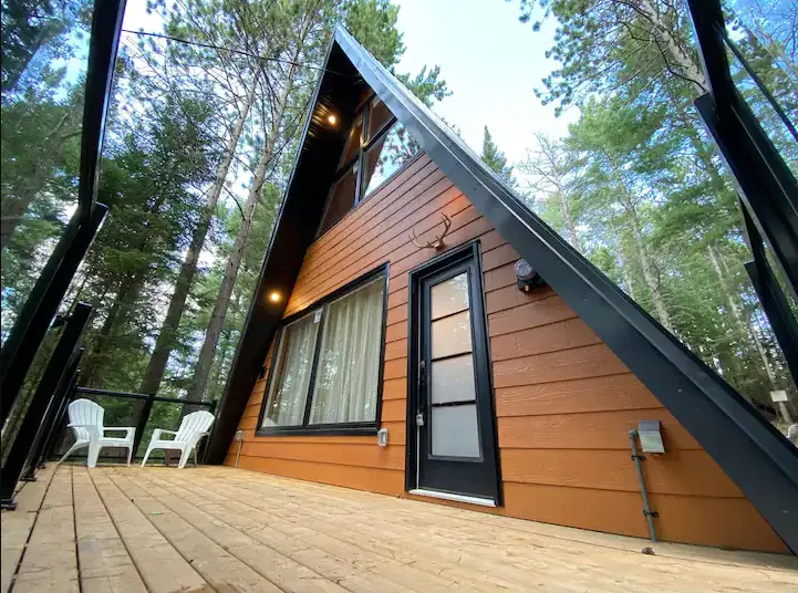 Tree-huggers would be wise to book this refurbished A-frame southeast of Bancroft pronto. Perched on a secluded hill, it’s surrounded by towering evergreens outside and wrapped in warm timber finishings inside. The open-concept main floor includes an updated kitchen with stainless steel appliances, a small bedroom, a bathroom, and a living/dining room with a television and gas fireplace. The second floor loft bedroom is a beauty in the sky. Lined with wood and with a large triangular window at the head of the bed, you’ll be dreaming of floating through the treetops in no time. There is no internet here and spotty cell service, but with two large decks, the sound of birdsong, and stunning wilderness views, why would you need digital distraction? As one recent visitor put it: “A great getaway from reality.”