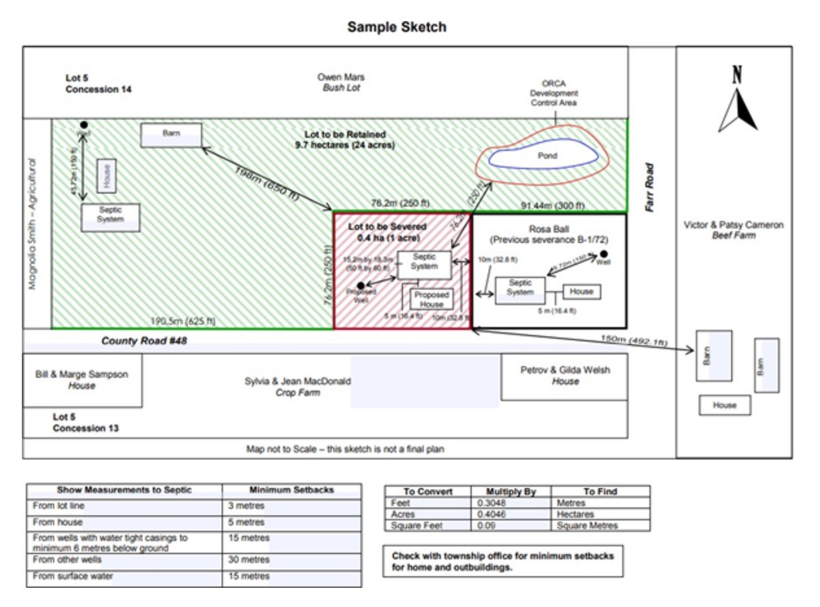 An application must include 2 copies of a sketch to scale (preferably prepared by an Ontario Land Surveyor) in accordance with the sketch guidelines on Appendix ‘A’. An application should also include any additional information that you may wish to provide or believe will be helpful in reviewing your application; it should also include information identified during the pre-consultation stage by planning staff or other agencies.